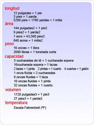 Sistema de medición actualmente utilizado con mayor frecuencia en los Estados Unidos. En el sistema habitual de medición, las unidades de distancia corta fueron introducidas con base en las dimensiones del cuerpo humano. Por ejemplo, la pulgada se utilizaba para representar el ancho de un pulgar y el pie se utilizaba para representar la longitud de un pie humano.